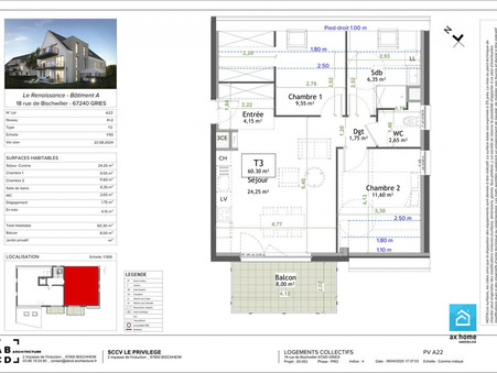 C'est sur la commune de GRIES que nous vous proposons notre tout nouveau programme immobilier :La RÃ?©sidence Le RenaissanceGRIES est en effet idÃ?©alement situÃ?© Ã? :- 7 mn de Bischwiller- 10 mn de Haguenau- 12mn de Brumath- 30 mn de StrasbourgLes liaisons se font tout naturellement en voiture, Bus CTBR ou Train via Kurtzenhouse Ã? 2 mn.Gries n'a rien Ã? envier aux grandes agglomÃ?©rations :Commerces, mÃ?©decins, Ã?©coles, pÃ?©riscolaires, crÃ?¨ches pour le confort de tous.Nous avons voulu pour vous une rÃ?©sidence Ã? taille humaine, 2 fois 7 logements composÃ?©e de larges et belles terrasses et de jardins oÃ?¹ il fait bon vivre, dotÃ?©e de l'ascenseur pour des dÃ?©placements facilitÃ?©s.DÃ?©couvrez cet appartement 3 piÃ?¨ces d'une surface de 61 m² .Il s'organise comme suit : une piÃ?¨ce Ã? vivre donnant sur sa terrasse, deux chambres, une salle d'eau et des toilettes sÃ?©parÃ?©es.Cet appartement se situe dans un petit immeuble de deux Ã?©tages avec ascenseur.Cet appartement est proposÃ?© Ã? l'achat pour 209 268 ââ??¬.Les frais d'agence sont Ã? la charge du vendeur.DÃ?©couvrez toutes les originalitÃ?©s de cet appartement Ã? vendre en prenant RDV avec notre Ã?©quipe.Notre offre propose des logements du F2 au F4.F2 Ã? partir de 136 824 ââ??¬F3 Ã? partir de 187 344 ââ??¬F4 Ã? partir de 294 680 ââ??¬Demandez votre RDV personnalisÃ?© en nous contactant via notre site www.axhome.net ou par tÃ?©lÃ?©phone au 03 88 61 37 09.Bien soumis au rÃ?©gime de la copropriÃ?©tÃ?©.Le DPE sera remis Ã? rÃ?©ception du logement.Les informations sur les risques auxquels ce bien est exposÃ?© sont disponibles sur le site GÃ?©orisques : www.georisques.gouv.frHonoraires Ã? la charge du vendeur. Dans une copropriÃ?©tÃ?© de 34 lots. Quote-part moyenne du budget prÃ?©visionnel 1 464 ââ??¬/an. Aucune procÃ?©dure n'est en cours. Non soumis au DPE. Les informations sur les risques auxquels ce bien est exposÃ?© sont disponibles sur le site GÃ?©orisques : georisques.gouv.fr. Carte pro. CPI 67012016000014808 AC ADC 6701 2020000243374.Ax'Home Immobilier - 2 agences de proximitÃ?© pour mieux vous accompagner. Oberhausbergen - 104A Route de Saverne (en face de Prowin)Wiwersheim - 33 AllÃ?©e de l'Economie (Galerie 'Au Jardin des Sens' au dessus d'Esprit Pain)